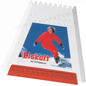 Trapez-Eiskratzer "Polar" mit grosser Werbefläche. Sehr auffällig ist die farbige Gummilippe, hierdurch kann sehr einfach eine Mehrfarbigkeit hergestellt werden, die diesen Eiskratzer sehr hochwertig erscheinen lässt.