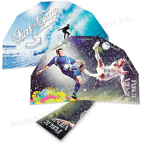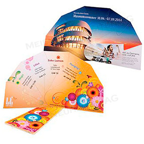 Bemerkungen: Durch eine einfache Stecktechnik entsteht aus dem mailingfähigen Werbe-Fächer ein grosser Informationsträger. Der Fächer ist auf beiden Seiten individuell gestaltbar.