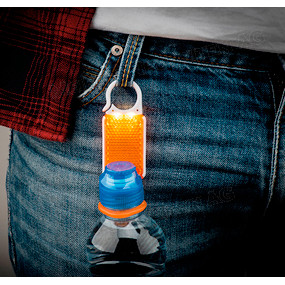 Flaschenhalter mit Reflektor inklusive 3 LED Leuchten mit 2 unterschiedlichen Lichteinstellungen. Einfach mit dem Karabiner-Haken anhängen.