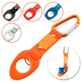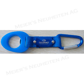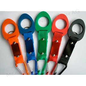 Karabinerhaken mit Nylonapplikation, Flaschenhalter und Schlüsselring. Ihre Werbung kann auf das Metallplättchen bedruckt oder gelasert werden.