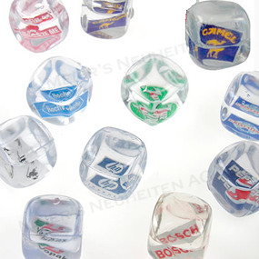 Logo-Eiswürfel kühlen Drinks, Früchte, Fisch usw. länger als Frisch-Eis (der Logowürfel wird mit destilliertem Wasser gefüllt), ohne die Getränke zu verwässern. Geschmacks und Geruchs neutral! Der Logo-Eiswürfel ist der erste glasklare Eiswürfel mit eingelegtem Markenlogo! Mit dem Logo-Eiswürfel erreichen Sie im Acrylkühler eine dauerhafte Flaschenkühlung von ca. 4 Stunden ohne lästiges Nachlegen von Frisch-Eis. Logo-Eiswürfel haben kein Abtropfwasser, darum können Sie auch bei Verletzungen problemlos kühlen. |