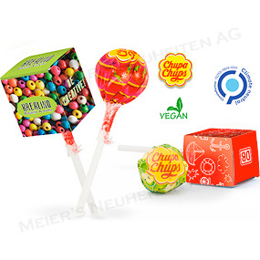 Bemerkungen: Der 12g Kugel-Lolly von Chupa Chups in den gemischten Geschmacksrichtungen Apfel, Orange, Erdbeere und Kirsche wird in der Box aus weissem Glanzkarton zum rundum sympathischen Werbeträger.
