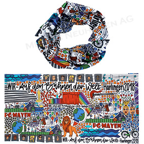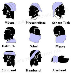 Multifunktionstuch als Halstuch, Schal, Stirnband, Augenbinde, Armband, Kopftuch, Mütze, Piratenmütze, Haarband, Nackenwärmer, Kopftuch, Maske usw. tragbar. Für alle Jahreszeiten, schützt ideal beim Wintersport, Motorradfahren, Outdoor-Aktivitäten. Aus weichem pflegeleichtem Polyester (Microfaser), komplett individuell bedruckbar (all over Digitaldruck), ohne störende Nähte. |
